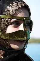 Closeup of a woman in Southern Iran wearing the battula