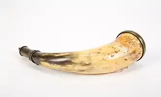 - horn, any of several wind instruments with one narrow end into which the musician blows