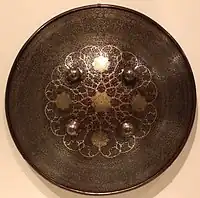 Borrowed from Arabic تُرْس (turs, “shield”), from Ancient Greek θυρεός (thureós).