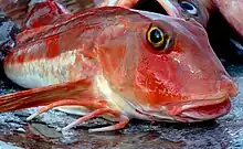 - red gurnard, any benthic, ray-finned fish of the species Chelidonichthys cuculus