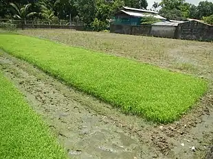 - And the other way [of transplanting rice] is when the earth is cut into divisions and water is introduced into it to stand a handspan high, then the seeds are strewn onto it, and when the earth is soaked by this water the rice is covered with sprinkled soil strewn onto it by the hands until some hours have passed and the soil which has been strewn on it is damp too, and the water shall stand in these beds continuously and without intermission.