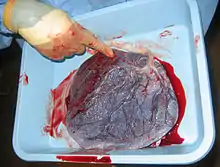 - (modern) the round or disk-shaped organ that grows during pregnancy in the wombs of the females of many species of child-bearing mammals (placental mammals) so as to transfer nutrients to the child, the placenta
