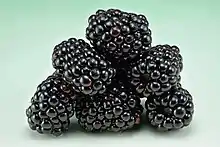 - blackberry (edible soft fruit consisting of a cluster of soft purple-black drupelets)