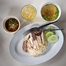 | Orthographic | ข้าวมันไก่ kʰ ˆ ā w m ạ n ai k ˋ | |