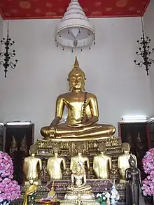 A white chàt hangs over a Buddha image at Wat Pho