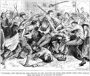 - (slang, humorous) mob action in which someone is attacked with stamps or thrusts of feet as punishment.