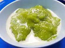 2. a paste-like food, made from eggs, sugar, and coconut milk or condensed milk, sometimes including pandan juice also, often served with breads or ปาท่องโก๋ (bpaa-tɔ̂ng-gǒo).