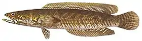 1. common snakehead fish, striped snakehead, chevron snakehead, banded snakehead (Channa striata, syn. Ophiocephalus striatus[1])