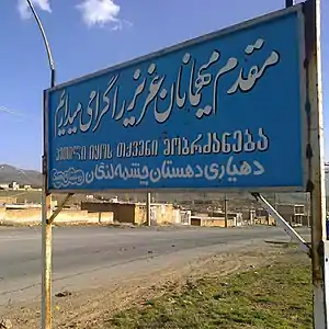 The sign welcoming comers in Georgian near Sibak, Isfahan, Iran as they comprise a large part of its inhabitants