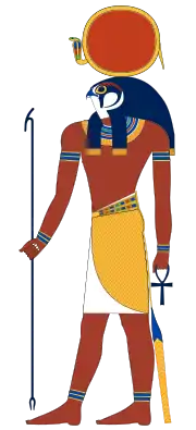 In one of his many forms, Ra, god of the sun, has the head of a falcon and the sun-disk inside a cobra resting on his head.
