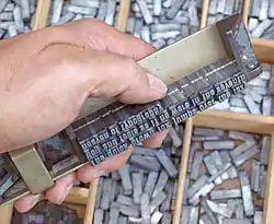 - (printing) a composing stick: a tool used in typesetting to compose a text using movable type, before moving the text to the galley for printing
