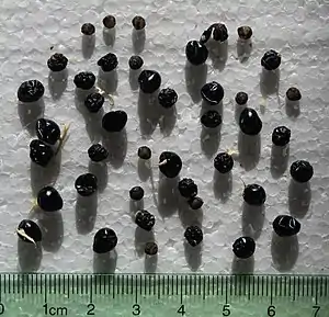 - a blackberry lily seed or fruit, usually one that is jet-black and spherical
