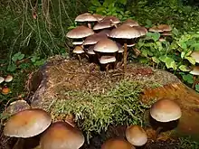- chestnut mushroom, brick cap, Hypholoma lateritium; a mushroom species endemic to Europe, Asia, and North America