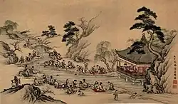 - the winding stream party, an ancient drinking game played during the Spring Purification Festival in which a cup of wine is floated down a stream with people seated on both side (the person sitting in front of the cup when it stops has to drink)