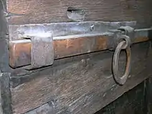 - a heavy, usually wooden, crossbar used to lock across double doors or gates of an entrance to a building, similar to a latch