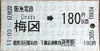 - A variant of 田, as in 梅田 (Umeda, place name in Osaka), used by Hankyu Railway. This way of writing was for easy identification of tickets to Umeda before ticket vending machines were introduced because the passenger flow of the station is the highest in the whole Hankyu system.