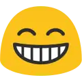 A yellow face with smiling eyes and full-toothed grin, as if saying Cheese! for the camera. Teeth may be smoothed-over or crosshatched.
