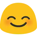 A yellow face with smiling eyes and a broad, closed smile turning up to rosy cheeks.