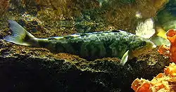 𩸽 (hokke): an Arabesque greenling / Okhotsk atka mackerel in a tank.