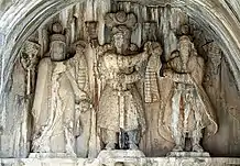 In this relief of an investiture scene, Ahura Mazda (right) presents the diadem of sovereignty to Khosrau Parviz.