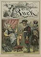 Cover of Puck magazine, dated October 3 1883, with a cartoon by Bernhard Gillam captioned "Barkis is willin'"
