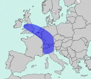 - A discontinuous corridor of urbanization in Western Europe, stretching from northwest England to Milan.