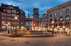 The Caritas Well (also known as the Caritas Fountain) during the evening in Copenhagen, Denmark.