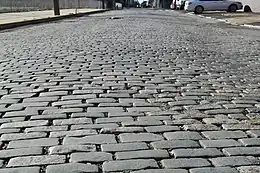 Kopfsteinstraße f (genitive Kopfsteinstraße, plural Kopfsteinstraßen, diminutive Kopfsteinsträßchen n)