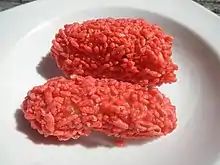 - snack made of sweetened or syruped puffed rice, or peanut, or popcorn shaped into a brick, ball or disc.