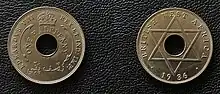 - (archaic) colonial era perforated coin, the British West Africa Penny [from 1910s]