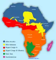 Map of spread of African language families, Bantu area shown in orange.