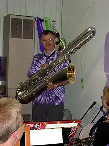 - A member of the saxophone family of woodwind instruments that is smaller than the contrabass saxophone but larger than the baritone saxophone, with a range of A♭1 to E♭4 or similar.