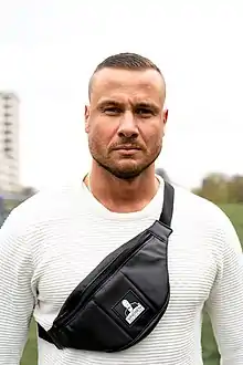 - (slang) a fanny pack, a bum bag, a waist bag (slung over the shoulder)