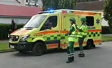 "Blåljuspersonal" beside an ambulance. Named such after the blue lights on emergency vehicles.