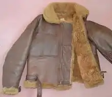 - A short leather jacket, with an elasticated waist and cuffs, a fleece collar and a zip front.