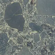 - (petrology) A rock composed of angular fragments in a matrix that may be of a similar or a different material.