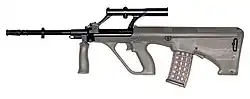The Steyr AUG is an example of a bullpup configuration, and was one of the first such configurations to enter widespread use.