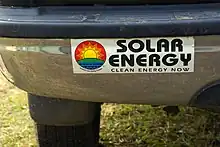 - (US) An adhesive label or decal, usually applied to the bumper or back end of an automobile, and displaying a short political, promotional, philosophical, or humorous message.