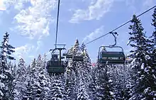 - A continuously moving series of open seats, slung from overhead cables, used to transport people (especially skiers) up the sides of mountains.