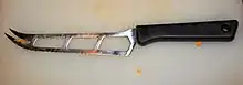 1. A type of knife used for cutting cheese, typically with a wide, curved blade.