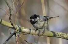 - One of the smallest birds of the tit family Paridae (Periparus ater), with a black cap, white nape patch and greyish body with buff underparts.