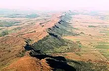 - (geomorphology) A hill or ridge with a gentle slope on one side, and a steep slope on the other.