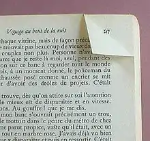 of a page in a book or other publication: having its corner folded down, either due to having been read many times, or intentionally as a sort of bookmark