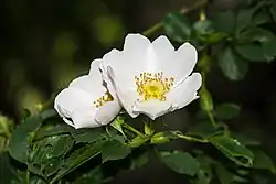 - A European wild rose shrub of species Rosa canina, having fragrant white or pink flowers and stems with sharp spines.