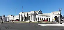 - headhouse, station building (portion of a passenger railway terminal not housing the tracks and platforms, comprising ticket counters, baggage facilities, etc.)