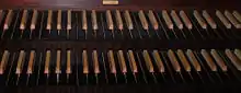 An organ keyboard, with wooden keys of ebony (dark) and maple (light)
