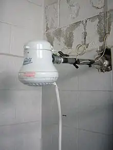 - a shower that heats water immediately before it is expelled, rather than drawing hot water from a tank