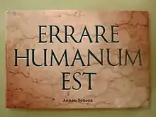 The beginning of a longer Latin saying: "Errare humanum est, perseverare autem diabolicum." It translates to: "To err is human, but to persist [in error] is diabolical." The saying is often attributed to Seneca but not attested in his works.