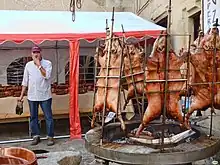 - (cooking) a wooden or metal skewer or spit for roasting