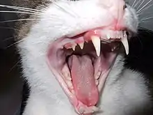 - A long, pointed canine tooth used for biting and tearing flesh.
